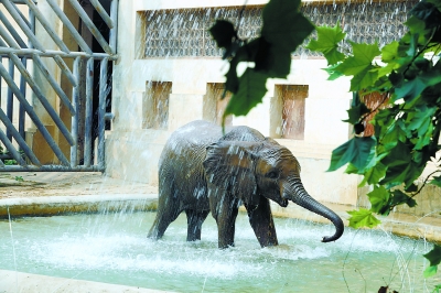 目前動物運動場的噴淋設備基本達到全覆蓋,全天不少于兩次噴淋作業(yè),以增強動物的體表舒適度。高溫炎熱時飼養(yǎng)員還會用水管對大熊貓、大象、犀牛、北極熊等進行人工沖涼。動物園還在犀牛運動場設置了泥浴池,在大熊貓館、大象館運動場建造了戲水池,讓動物體驗“水上樂園”的樂趣。