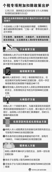 從明年開始,除大病醫(yī)療外,子女教育、贍養(yǎng)老人、住房貸款利息、住房租金、繼續(xù)教育,職工均可在單位發(fā)放工資薪金時,按月享受專項附加扣除政策!