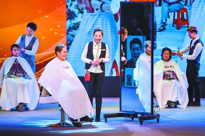 獲獎的年輕美發(fā)師張中天(中)展示美發(fā)服務(wù)場景。本報記者 鄧偉攝