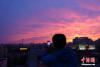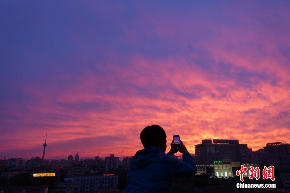 北京雨后現(xiàn)壯美火燒云,民眾拍攝美景。中新社記者蘇丹 攝