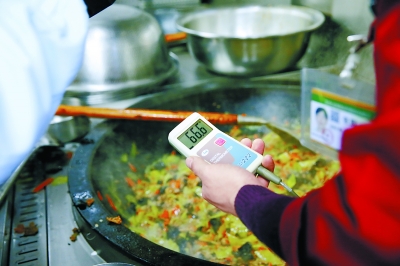 星級(jí)食堂到底長啥樣?記者上午做了探訪,換上食堂專用工作服、戴上鞋套、佩戴口罩,走進(jìn)食堂,一側(cè)便是醒目的食堂員工儀容儀表標(biāo)準(zhǔn)規(guī)范:頭發(fā)不外露、請(qǐng)戴口罩、手沒有傷口、不留長指甲、不抹指甲油、不佩戴戒指、肩上無落發(fā)、不戴耳環(huán)……深入食堂,主食初加工區(qū)、細(xì)加工區(qū)、熱加工區(qū)、消毒庫、洗碗間、主食加工區(qū)、備餐間各個(gè)空間劃分井井有條。記者注意到,食堂將清洗區(qū)域做了細(xì)致的分工,雞蛋、肉類、魚類分池清洗;抹布也是各司其職,衛(wèi)生專用、死角專用、切配間操作專用毛巾用不同顏色區(qū)分。臨近午餐時(shí)間,廚師長拿出了一個(gè)細(xì)細(xì)的探頭,探頭一側(cè)連有溫度顯示屏,細(xì)細(xì)消毒后,廚師長將探頭插入鍋內(nèi)正在翻炒的筍片炒肉中,“66.6攝氏度,溫度不夠,還要再加溫!睆N師長解釋說,按照相關(guān)要求,肉菜出鍋溫度應(yīng)達(dá)到90攝氏度,半葷菜需要達(dá)到80攝氏度,素菜出鍋時(shí)也要達(dá)到70攝氏度,“一方面是為了衛(wèi)生,一方面也是為了讓孩子吃的時(shí)候飯還熱乎!
