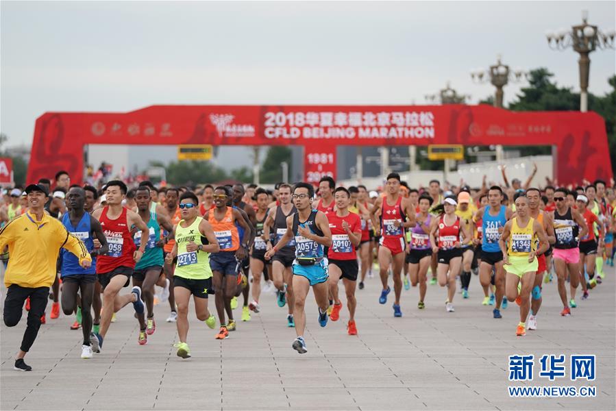 當(dāng)日,2018北京馬拉松賽在北京天安門廣場(chǎng)開跑。 新華社記者鞠煥宗攝
