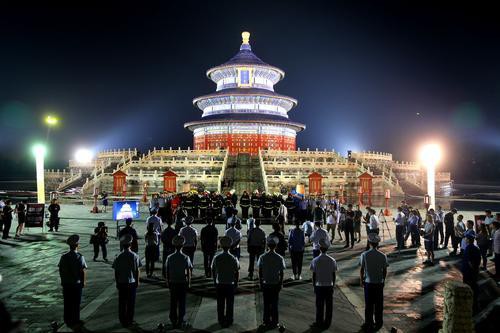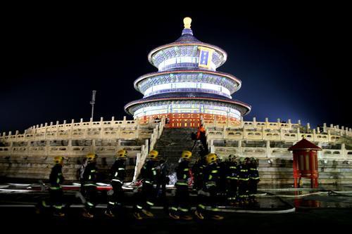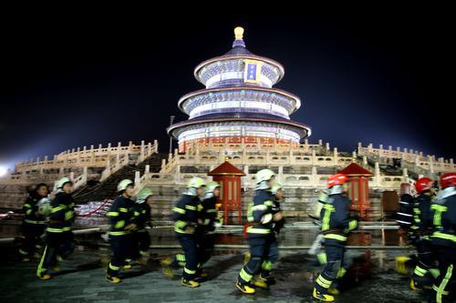 2019年9月6日晚,消防隊員從祈年殿四個方向架設移動水炮、消防機器人和云梯車對祈年殿起火部位進行撲救。當晚,北京東城消防支隊聯(lián)合天壇公園舉辦了文物古建應急救援綜合演練。此次演練,包括人員疏散、搶救文物、滅火救援等突發(fā)事件的處置,歷時約40分鐘。