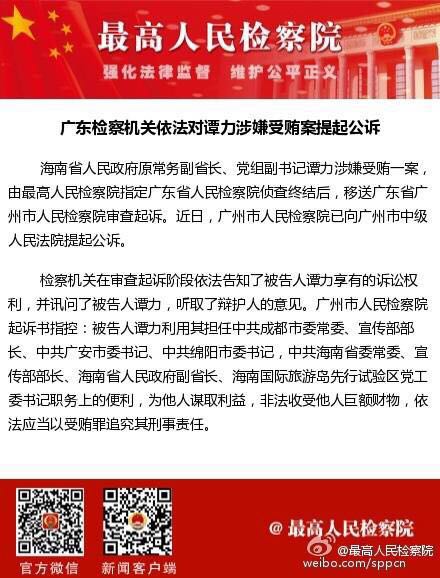 央廣網(wǎng)北京11月24日消息(記者孫瑩)廣東檢察機(jī)關(guān)依法對(duì)譚力涉嫌受賄案提起公訴。