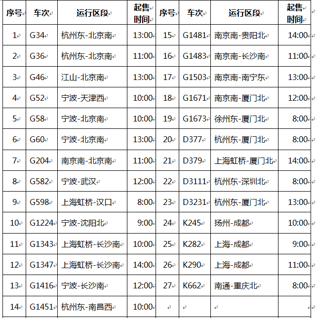 央廣網(wǎng)北京12月31日消息 記者從上海鐵路局獲悉,根據(jù)部分鐵路線路擴(kuò)能改造施工和維修的進(jìn)度安排,又一大波列車車票開(kāi)始發(fā)售。具體如下: