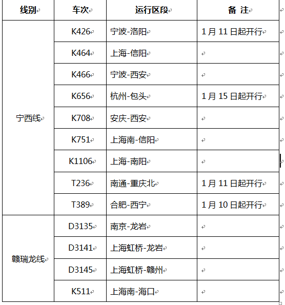 二、根據(jù)寧西(南京—西安)線旅客列車新舊時(shí)刻交替方案、贛瑞龍(贛州—瑞金—龍巖)有關(guān)旅客列車調(diào)整開(kāi)行及新舊交替方案等安排,自2016年1月2日8:00起,寧西線和贛瑞龍線相關(guān)旅客列車車票統(tǒng)一對(duì)外發(fā)售,有關(guān)車次見(jiàn)附件2。