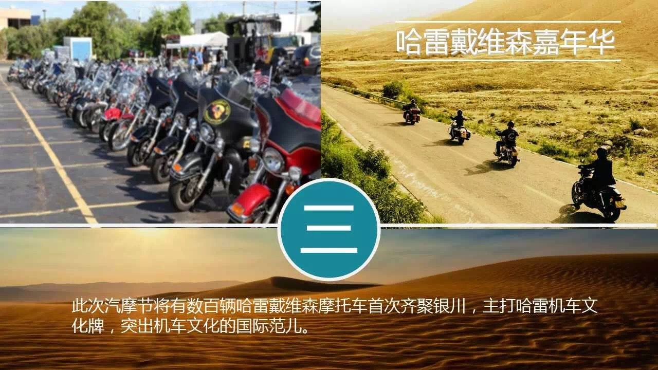 2016年8月7日至9日,首屆中國·寧夏(銀川)絲綢之路國際汽車摩托車自駕旅游節(jié)暨哈雷戴維森中國第八屆全國車主騎行活動將在寧夏回族自治區(qū)首府銀川市舉辦。據(jù)介紹,本屆汽摩節(jié)將舉辦“絲路旅行從銀川啟航”攝影大賽、黃河風情民俗展演、賀蘭山汽車摩托車場地賽、機車大巡游、水上運動表演、汽摩節(jié)狂歡夜、哈雷戴維森嘉年華、汽摩車友暢游銀川等八大系列活動,突出四大亮點: