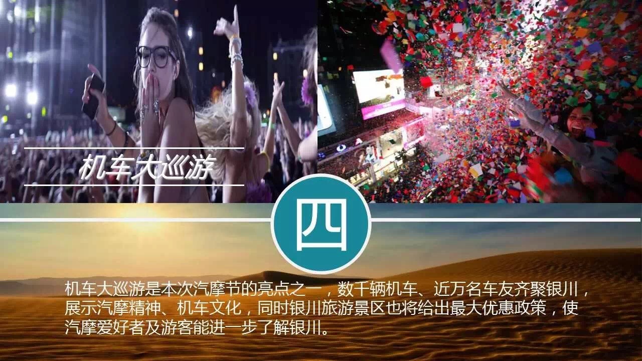 四大點亮包括“穿越絲路 從銀川啟航”為主題的汽車摩托車穿越活動,將會穿越美國、迪拜等國際化現(xiàn)代大都市;亮點二是濱河之夜全國體育娛樂明星愛心足球賽,本次明星賽是此次汽摩節(jié)的開幕環(huán)節(jié),已邀請到由孫楠領(lǐng)銜的國內(nèi)體育界、演藝界明星組成的明星足球隊來銀進行慈善表演比賽;亮點三是哈雷戴維森嘉年華將在銀川盛大舉行,屆時將有數(shù)百輛哈雷戴維森摩托車首次齊聚塞上,并舉行絲路銀川穿越之旅,在閱海舉行狂歡節(jié),點燃盛夏激情,同時還有路虎、美國吉普、房車以及專業(yè)賽車等前來助陣;亮點四是銀川十大景區(qū)為本次汽摩節(jié)傾情助陣,提供優(yōu)惠政策,前來參加汽摩節(jié)的車手可免費參觀各大景點。