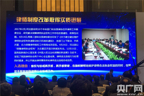 2017年2月,司法部會同10個中央部門和全國律協(xié)召開律師工作聯(lián)席會議,研究解決保障律師執(zhí)業(yè)權(quán)利工作存在的普遍性、政策性問題。4月14日,兩高三部和全國律協(xié)聯(lián)合印發(fā)了《關(guān)于建立健全維護(hù)律師執(zhí)業(yè)權(quán)利快速聯(lián)動處置機(jī)制的通知》,各部門上下聯(lián)動、齊抓共管、合力保障律師維權(quán)工作格局成效顯現(xiàn)。4月26日,司法部以“保障律師執(zhí)業(yè)權(quán)利”為主題召開首次新聞發(fā)布會。12月15日,國務(wù)院新聞辦公室發(fā)表《中國人權(quán)法治化保障的新進(jìn)展》白皮書,呈現(xiàn)了我國律師協(xié)會兩個中心全覆蓋成果。律師違法違規(guī)行為處理同時提速,并公開披露律師事務(wù)所和律師違法違規(guī)懲戒信息。
