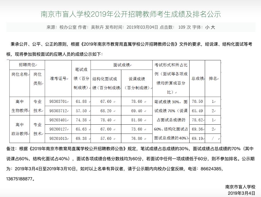 記者在南京市盲人學校網(wǎng)站上看到,鄭榮權的筆試和面試總成績名列第一位。但面試通過后,他的體檢結論為“不合格”,主要是因為視力問題。鄭榮權認為,他完全有能力勝任盲校的教師崗位。他說:“不論從我個人的實踐經(jīng)歷來說,還是從已經(jīng)在盲校工作的教師來說,或者是相關專家的研究,沒有一個實例證明盲人不能在盲校教書!