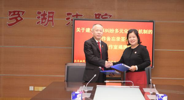 一帶一路國(guó)際商事調(diào)解中心粵港澳大灣區(qū)中心主任涂江麗與深圳市羅湖區(qū)人民法院訴訟服務(wù)中心主任胡建忠簽署《關(guān)于建立商事糾紛多元化解決機(jī)制的合作備忘錄》(央廣網(wǎng)發(fā) 法院供圖)