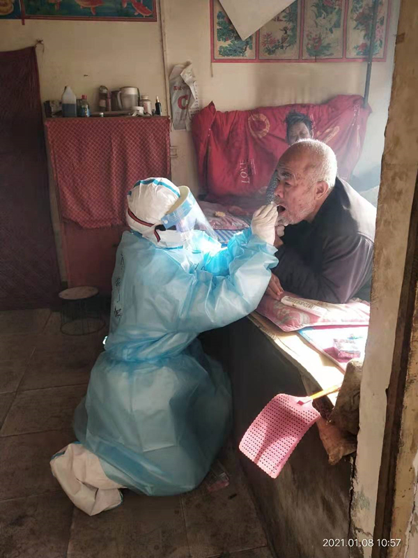 藁城區(qū)是高風(fēng)險(xiǎn)地區(qū),對于重點(diǎn)人群、區(qū)域要進(jìn)行多次核酸檢測。郭嬌嬌說,她平均每天要給三四百人做核酸采集工作,印象最深的是一位老人。入戶到老人家里,當(dāng)時(shí)老人躺在床上,為了更清楚地看到采集部位,保證標(biāo)本采集質(zhì)量,郭嬌嬌跪在地上,用手托住老人的下頜。她說:“當(dāng)時(shí)入戶采集的時(shí)候,這一家這個(gè)老爺爺可能家里邊沒有孩子,只有老爺爺跟老奶奶在家,門口也沒有門,只有玉米穗堆成的墻頭。進(jìn)去之后,老奶奶就在床上坐著,老爺爺在床上趴著,因?yàn)樗粍泳蜁,我就說你不用動,我就直接蹲下給他采集的,完了之后老爺爺還說你們太辛苦了,坐會吧。”