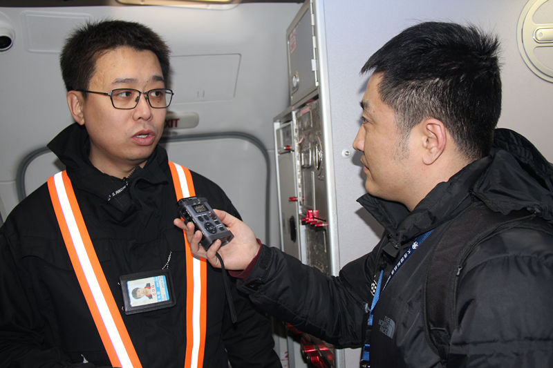 大連機(jī)場機(jī)務(wù)工程部波音維修分部副經(jīng)理王兆勛(左)接受央廣記者賈鐵生采訪
