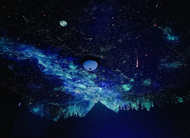 克里斯平說:“繪制墻面的油漆在白天看不見,只能在黑暗中發(fā)光,所以我只能在微暗的房間里,踩在結(jié)實的梯子上伴著音樂繪畫!彼做了針葉林模板,用藍色膠帶貼在天花板下方。當燈光熄滅的時候,一抬頭就能看見璀璨的星空。