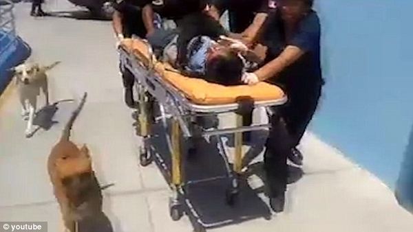 據(jù)說,這名男子喝酒時突然摔倒,頭部受傷并昏迷。救護車送其去醫(yī)院接受治療時,他的兩只寵物狗主動跳上救護車,不愿離開,一路護送他到醫(yī)院。途中,兩只寵物狗仔細觀察著救護人員的一舉一動,還時不時用鼻子親昵地蹭昏迷男子。該男子被推進醫(yī)院時,兩只寵物狗一路小跑生怕落后,還不時跳上擔架床看看,似乎在告訴他“我們一直都在陪著你”。