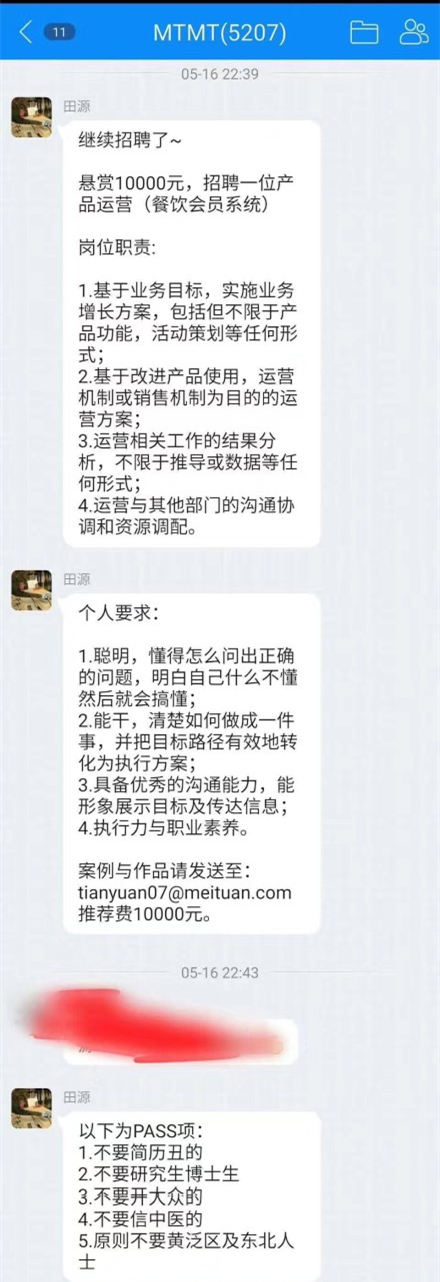 從微博爆料出來的截圖上看,這則招聘信息是發(fā)布在標(biāo)注為“MTMT”的qq群里。發(fā)布人在群里的名字叫田源,信息上稱“懸賞一萬,招聘一位產(chǎn)品運(yùn)營”,崗位職責(zé)是“基于業(yè)務(wù)目標(biāo),實(shí)施業(yè)務(wù)增長方案”等,發(fā)布者的個(gè)人要求是,“聰明,能干,具有執(zhí)行力與職業(yè)素養(yǎng)”等。在這兩條信息后,發(fā)布者還發(fā)布了5條限制,說“不要簡歷丑的,不要研究生博士生,不要開大眾的,不要信中醫(yī)的,原則不要黃泛區(qū)及東北人士”。
