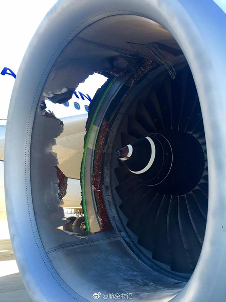 從已知的圖片等信息來看,余明認(rèn)為是發(fā)動機前側(cè)的外殼出現(xiàn)了破損,能看見比較大的洞。破損原因有很多種,一是發(fā)動機自己內(nèi)部出現(xiàn)故障,比如零件飛脫或者破裂,外皮給弄破了。但同時也不能排除是鳥撞等外部原因?qū)е掳l(fā)動機出現(xiàn)破壞。具體還要等后續(xù)調(diào)查清楚才能下結(jié)論。