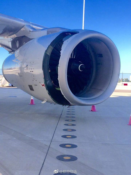 據(jù)了解,出現(xiàn)故障的是空客A330寬體客機,從現(xiàn)場圖片可以看到,客機一側(cè)發(fā)動機機匣出現(xiàn)了很大的裂縫。