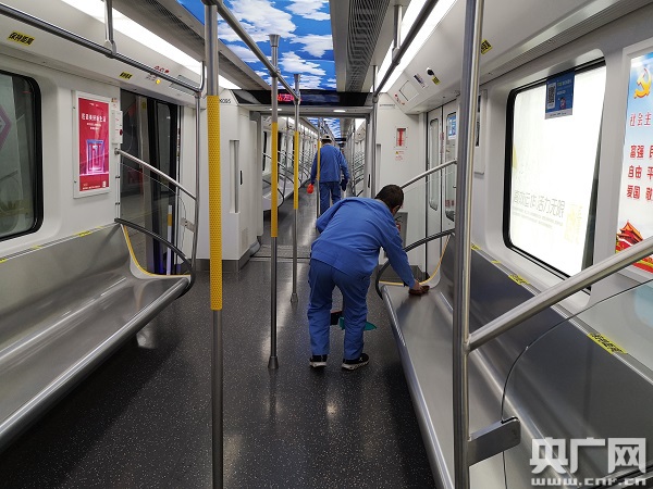 地鐵11號(hào)線列車(chē),工作人員在為車(chē)廂消殺清潔(中央廣播電視總臺(tái)央廣記者 肖源 攝)