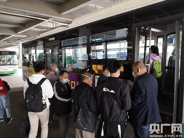 掃碼測(cè)溫后等待上公交車(chē)的市民(中央廣播電視總臺(tái)央廣記者 肖源 攝)