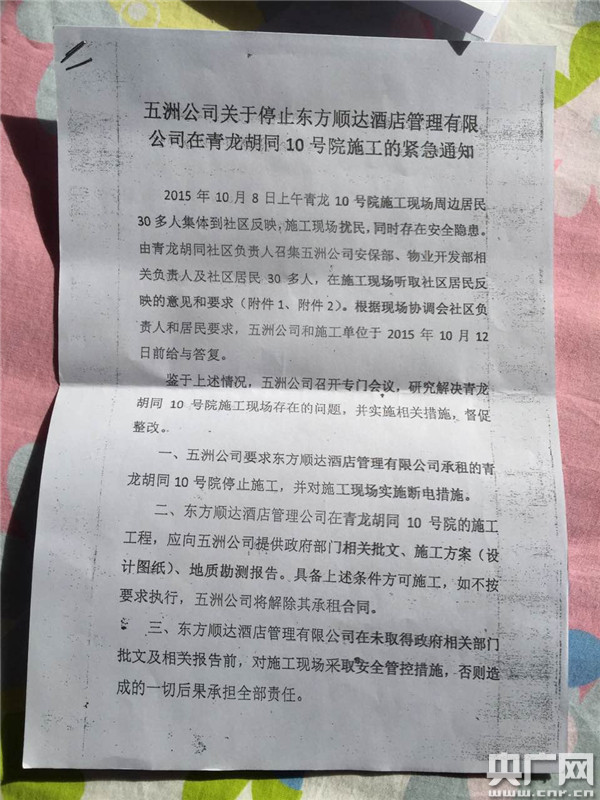 五洲公司關(guān)于停止東方順達(dá)酒店集團(tuán)有限公司在青龍胡同10號(hào)院施工的緊急通知