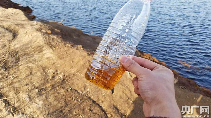 記者用礦泉水瓶盛出一些坑內的水體,呈半透明的棕色,氣味更加明顯。(央廣記者 白杰戈 王逸群 攝)