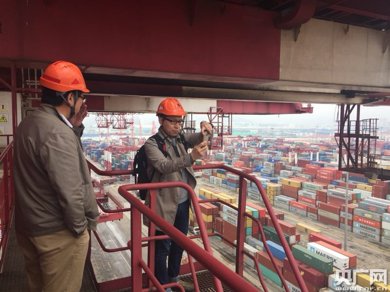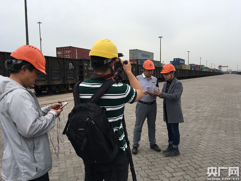 央廣記者柴安東(右一)、央視攝像趙迎晨(左二)在采訪陸橋國際貨運(yùn)代理有限公司報關(guān)中心經(jīng)理王欣(右二)