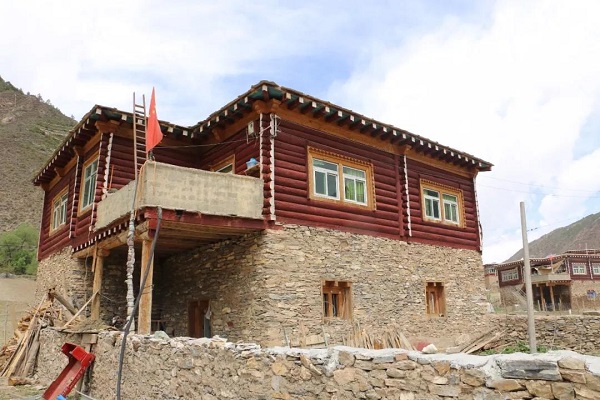 在江永次仁老人的指引下,我沿著江邊公路來到崗?fù)写澹慌排弄?dú)具藏東特色的院落映入眼簾。村里的房屋和西藏其他地方有明顯的區(qū)別,屋子分上下兩部分,下面都是灰白色石塊堆砌而成,而上面都是深紅色木板搭建。在藍(lán)天白云的映襯下顯得十分美麗。