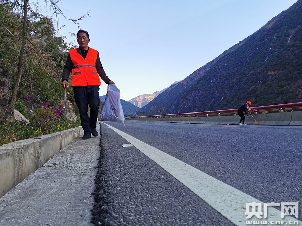 楊文忠在公路清潔養(yǎng)護(hù)(中央廣播電視總臺央廣記者 李騰飛 攝)