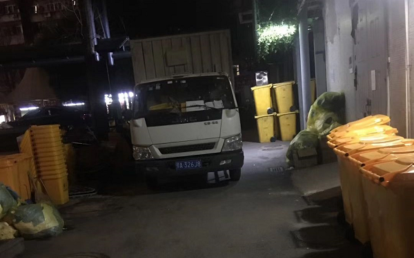 駕駛員陳小芬兼著搬運(yùn)工的工作,從車上把48個(gè)空桶搬下車,擺放在醫(yī)院暫存間的一邊,再與醫(yī)院的保潔人員一起,將裝滿醫(yī)廢的垃圾桶搬上車,全程一直有人對(duì)垃圾桶噴灑消毒。