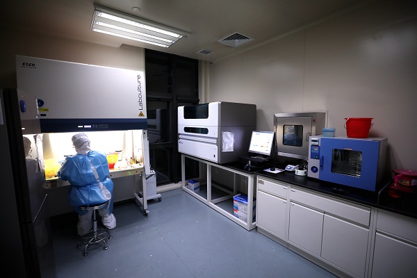 北京天壇醫(yī)院是新冠肺炎疫情發(fā)生以來,主管部門新批準(zhǔn)的新冠病毒核酸檢測機構(gòu)之一。天壇醫(yī)院實驗診斷中心主任張國軍介紹,他們在1月26日(正月初二)接到通知,準(zhǔn)備開展新冠病毒核酸檢測工作,隨后擬定工作流程,在現(xiàn)有的基因擴增(PCR)實驗室基礎(chǔ)上完善功能,比如為負(fù)壓房加裝壓力表,讓安全狀況更加直觀。張國軍說:“從標(biāo)本的采集、運送、管理、檢驗,到性能的評估,再到最后結(jié)果的報告,我們用一周的時間基本上就完成了整個流程的梳理。我們在樓道里面又加裝了一些紫外燈和壓力表!