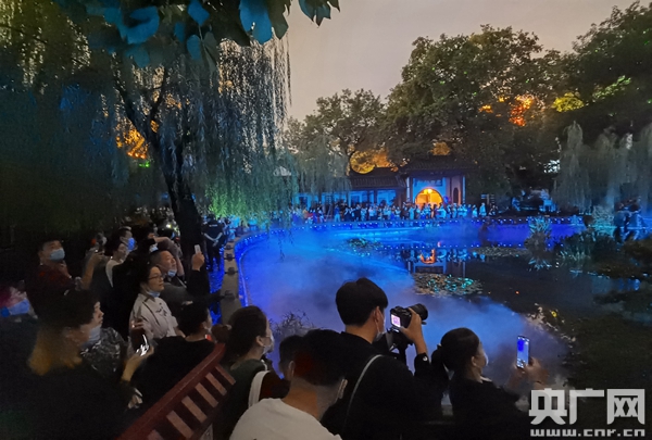 在黃鶴樓鵝池欣賞實(shí)景表演的市民朋友 (央廣記者常亞飛 攝)