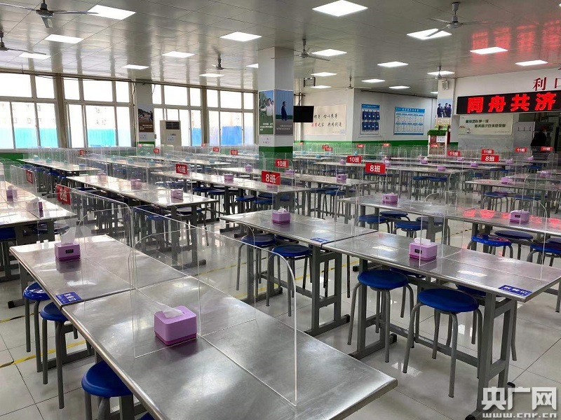 記者在食堂內(nèi)看到,每個(gè)座位上都用透明塑料板做了間隔。婁延果說(shuō):“擋板是透明的。我們當(dāng)時(shí)的考慮是,要讓同學(xué)們互相之間還能看得到,都是自己的同學(xué),感覺(jué)親切一點(diǎn),但是擋板要把每個(gè)人的就餐位置隔開(kāi),所有同學(xué)都在擋板前吃飯!