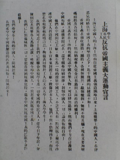 《上海學生市民工人反抗帝國主義大運動宣言》