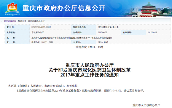 。ㄓ浾 黃宇)13日,重慶市政府網(wǎng)公布了《重慶市人民政府辦公廳關(guān)于印發(fā)重慶市深化醫(yī)藥衛(wèi)生體制改革2017年重點工作任務(wù)的通知》(以下簡稱《通知》),明確了全面推進公立醫(yī)院綜合改革的時間和范圍,要求在2017年8月底前,所有公立醫(yī)院啟動改革,全面取消藥品加成(中藥飲片除外),建立公立醫(yī)院由服務(wù)收費和政府補助兩個渠道補償?shù)男聶C制,推動新舊運行機制平穩(wěn)轉(zhuǎn)換。