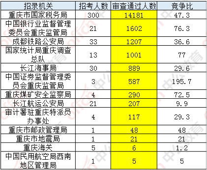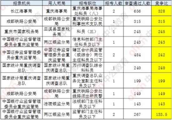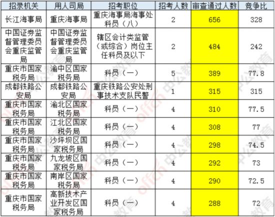2018年國考報名于8日18時結(jié)束,據(jù)統(tǒng)計,截至當(dāng)日17:30,工作地點在重慶的職位通過審核總?cè)藬?shù)為20161人,共有4個職位無人通過審核,其中一個職位無人報考,平均競爭比例為46.1:1。最熱職位為基層一線海事執(zhí)法崗,招錄2人,共有656人通過審核,競爭比為328:1。