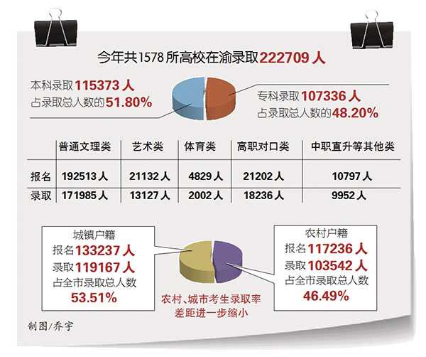 8月14日,市教育考試院發(fā)布消息,我市2018年普通高校招生錄取工作全部結(jié)束。今年全市高考報(bào)名共250473人,在渝招生高校共1578所,各類(lèi)各批次共錄取222709人,本、專(zhuān)科錄取人數(shù)幾乎各占一半。值得提醒的是,未被錄取的考生還有最后一次專(zhuān)科補(bǔ)錄的機(jī)會(huì),填報(bào)志愿的時(shí)間是9月23日14:00至9月24日12:00。