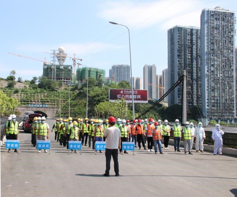 央廣網(wǎng)重慶8月17日消息(通訊員趙凱)8月17日,中建土木西南公司紅巖村橋隧項(xiàng)目聯(lián)合附近醫(yī)院在重慶九龍坡區(qū)五臺(tái)山立交開展疫情演練和防控培訓(xùn)活動(dòng),業(yè)主單位代表、中建土木西南公司各部門、項(xiàng)目疫情常態(tài)化防控指揮部成員、防疫管理員以及分部勞務(wù)人員參加演習(xí)。