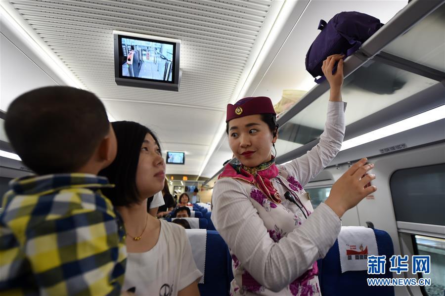 5月2日,在重慶火車北站,一對乘坐高鐵的母子通過“成渝高鐵”微客服得到乘務(wù)員的重點(diǎn)照顧。新華社記者唐奕 攝 -