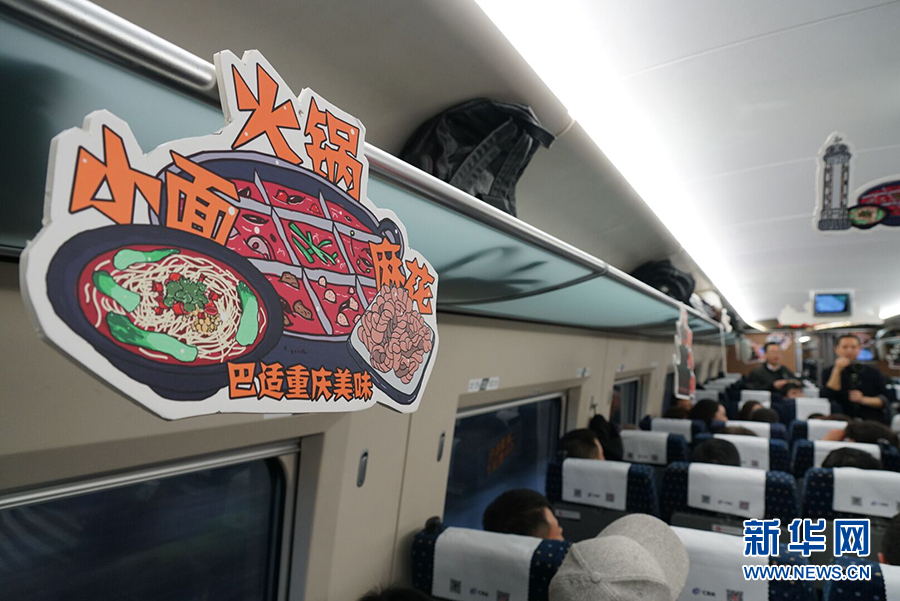 渝貴鐵路25日正式開通,重慶始發(fā)的D8581次實(shí)現(xiàn)2小時(shí)直達(dá)貴陽(yáng)。圖為以重慶、貴州兩地特色元素裝扮的主題車廂。新華網(wǎng) 張免 攝 -