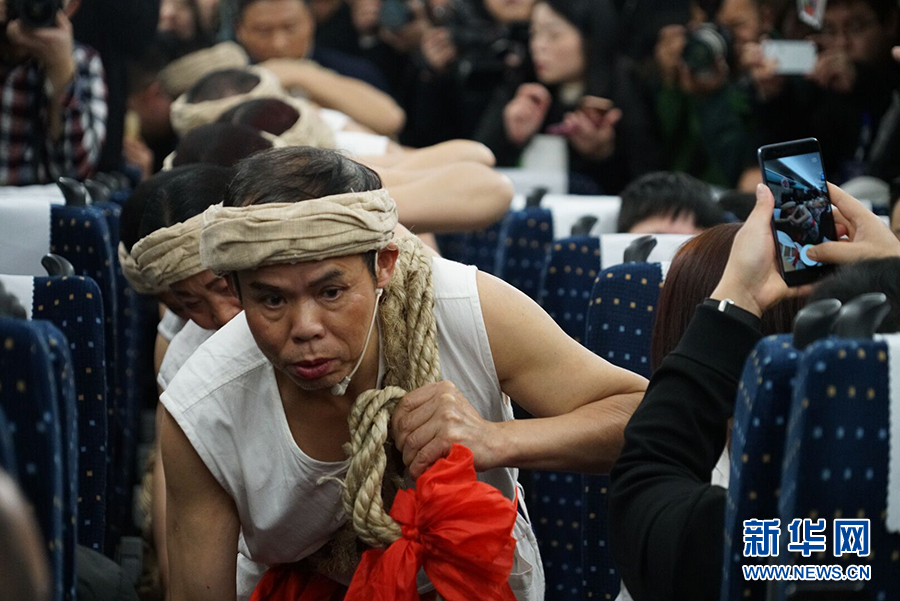 渝貴鐵路25日正式開通,重慶始發(fā)的D8581次實(shí)現(xiàn)2小時(shí)直達(dá)貴陽(yáng)。圖為車廂內(nèi)的川江號(hào)子表演。新華網(wǎng) 張免 攝 -