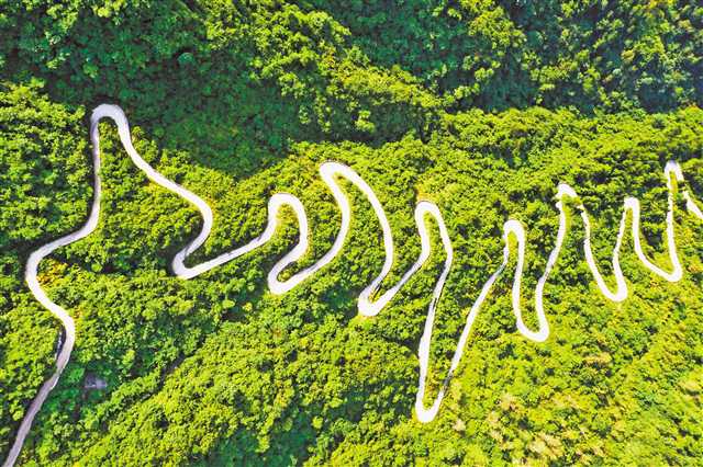 這條路位于海拔1500多米的小朝門山,蜿蜒盤旋,有41道拐,甚是壯觀。這條扶貧公路不僅帶動了當?shù)氐漠a(chǎn)業(yè)發(fā)展,也逐漸成為一條各地游客關(guān)注的自駕游公路。(特約攝影 楊敏)
