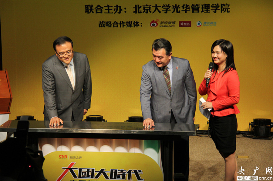 中央人民廣播電臺臺長王求(左二)和北京大學(xué)光華學(xué)院黨委書記冒大衛(wèi)(左一)共同啟動《大國大時代》(央廣網(wǎng) 李雪南 攝)