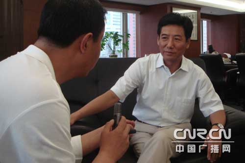圖為中央臺記者張四清采訪大連銀行行長王勁平