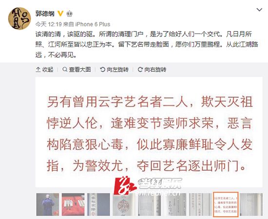 歐弟的師傅郭德綱也更新微博,曬出德云社的“家規(guī)”,稱:“該清的清,該驅(qū)的驅(qū)。所謂的清理門戶,是為了給好人們一個交代。凡日月所照、江河所至皆以忠正為本。留下藝名帶走臉面,愿你們?nèi)f里鵬程。從此江湖路遠,不必再見!蔽⒉┑钠渲幸粡埮鋱D稱:“另有曾用云字名者二人,欺天滅祖悖逆人倫,逢難變節(jié)賣師求榮,惡言構(gòu)陷意狠心毒,似此寡廉鮮恥令人發(fā)指,為警效尤,奪回藝名逐出師門!边@番話不少人都認為是暗指與其脫離師徒關(guān)系的曹云金與何云偉。