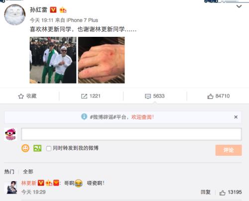 日前,孫紅雷分享了和林更新一起錄制《極限挑戰(zhàn)》的照片,并一同曬出自己擦傷明顯、多處流血的右手,配文稱(chēng):“喜歡林更新同學(xué),也謝謝林更新同學(xué)……”林更新隨后轉(zhuǎn)發(fā)并回復(fù)孫紅雷,“哥啊,碰瓷啊!”圖片中,孫紅雷與林更新正在錄制中,孫紅雷舉起右手指點(diǎn)傷疤,嬉笑著和面前的人解釋?zhuān)指挛挥谒砗,看不出表情?/p>