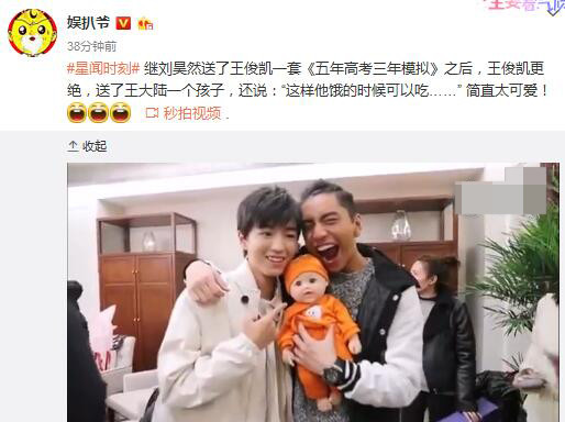 2月21日,據(jù)博主“娛扒爺”爆料,王俊凱近日碰到王大陸,一見面,他就送了王大陸一個(gè)“孩子”——當(dāng)然是個(gè)公仔娃娃啦,然后還調(diào)侃說王大陸?zhàn)I了可以吃。