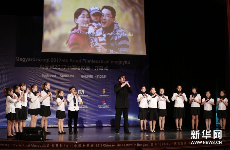 4月23日,在匈牙利首都布達(dá)佩斯舉行的2017中國(guó)電影展開幕式上,中國(guó)香港演員成龍(中)與匈中雙語學(xué)校的學(xué)生演唱歌曲《國(guó)家》。 2017中國(guó)電影展23日在匈牙利首都布達(dá)佩斯開幕。在歷時(shí)7天的電影展期間將放映《功夫瑜伽》《大唐玄奘》《湄公河行動(dòng)》《北京遇上西雅圖之不二情書》《山河故人》等5部?jī)?yōu)秀中國(guó)影片。新華社記者葉平凡攝 -