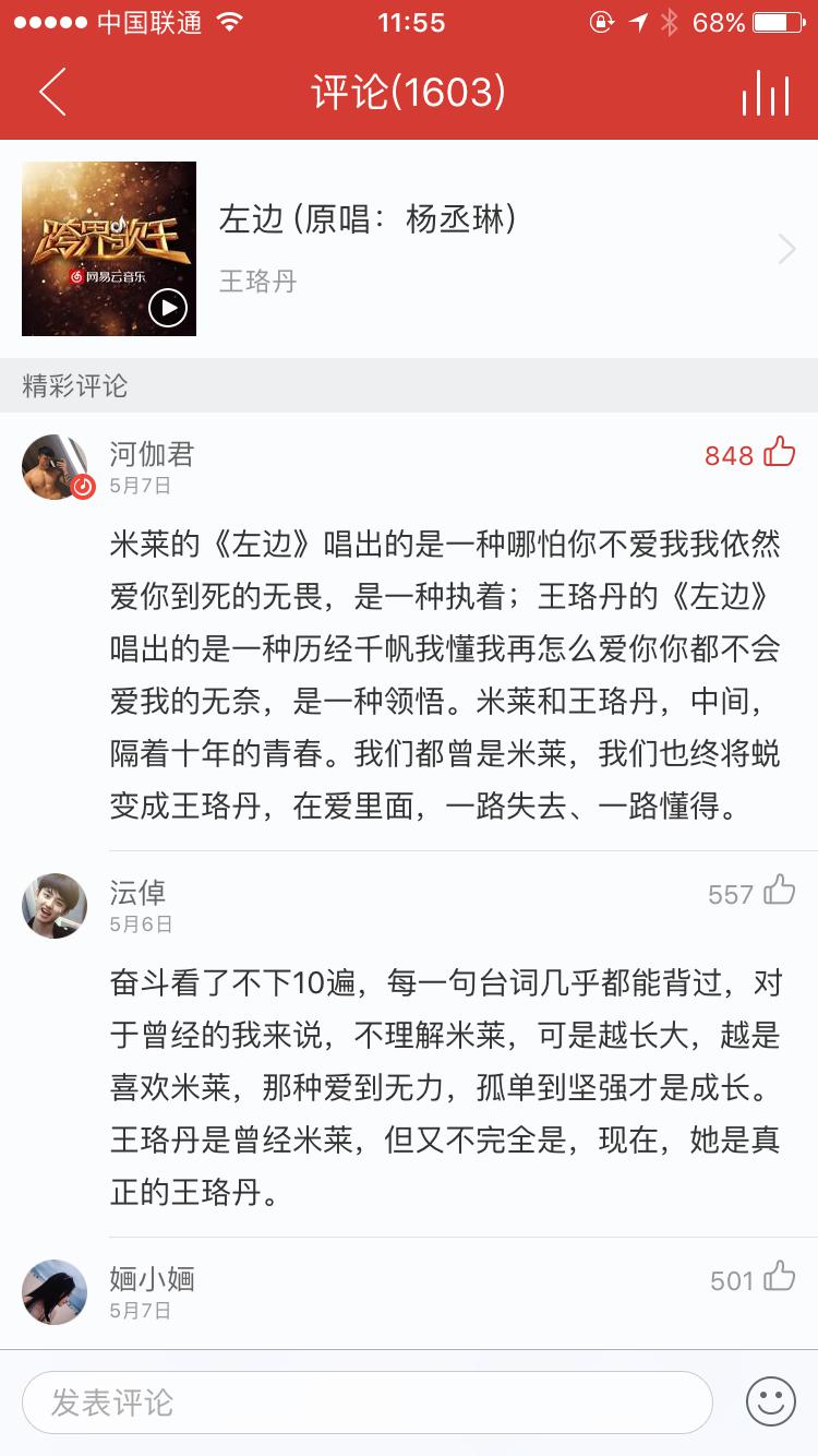 如果說十年前,米萊在《奮斗》中演唱的《左邊》,帶著初生牛犢不怕虎的無畏沖勁,那么十年后,王珞丹在2017《跨界歌王》上,則唱出了歷經(jīng)風(fēng)霜的領(lǐng)悟和懂得。來自網(wǎng)易云音樂用戶河伽君評論如是說,“米萊和王珞丹,中間,隔著十年的青春。我們都曾是米萊,我們也終將蛻變成王珞丹,在愛里面,一路失去、一路懂得!比缃,這條評論已經(jīng)贏得了800多用戶的點贊。