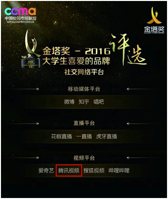 2017中國(guó)校園市場(chǎng)年度峰會(huì)暨金塔獎(jiǎng)是在中國(guó)青少年新媒體協(xié)會(huì)和全國(guó)學(xué)校共青團(tuán)新媒體運(yùn)營(yíng)中心的指導(dǎo)下,由中國(guó)校園市場(chǎng)聯(lián)盟等組織和企業(yè)聯(lián)合協(xié)辦的校園市場(chǎng)行業(yè)最權(quán)威的獎(jiǎng)項(xiàng)。此次頒獎(jiǎng)典禮上,騰訊視頻喜獲“2016年度大學(xué)生喜愛的視頻平臺(tái)”榮譽(yù),當(dāng)之無愧地成為當(dāng)代大學(xué)生認(rèn)同又認(rèn)可的內(nèi)容平臺(tái),也是影響年輕群體核心價(jià)值觀的重要渠道。